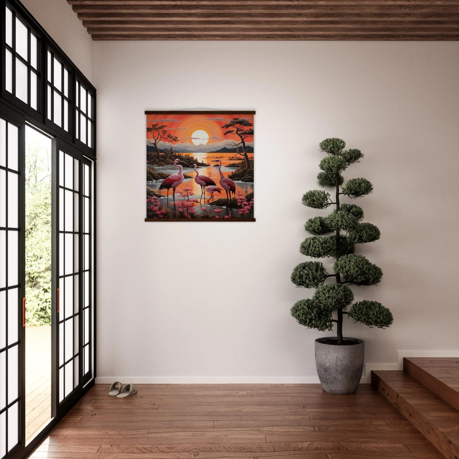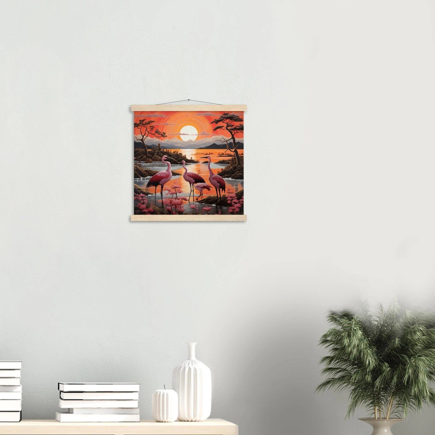 Sakura trees, cranes, landscape, the setting sun and you have the contemporary Japanese painting