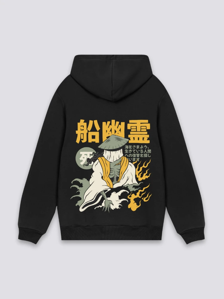 Immerse yourself in the mysterious world of Japanese folklore with this Cool Japanese Hoodie! The design showcases a ghostly spirit, inspired by legends of wandering boat ghosts seeking redemption. The captivating graphic and Japanese script add an authentic touch to this streetwear clothing, perfect for fans of Asian mythology. Ideal for a unique look, this hoodie celebrates the fusion of tradition and modernity, creating a style that is both mystical and unforgettable!
