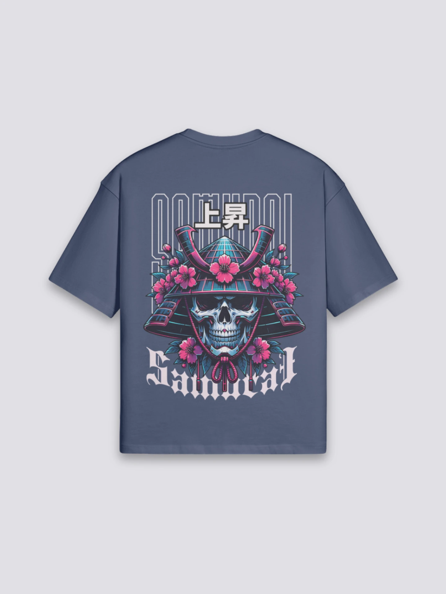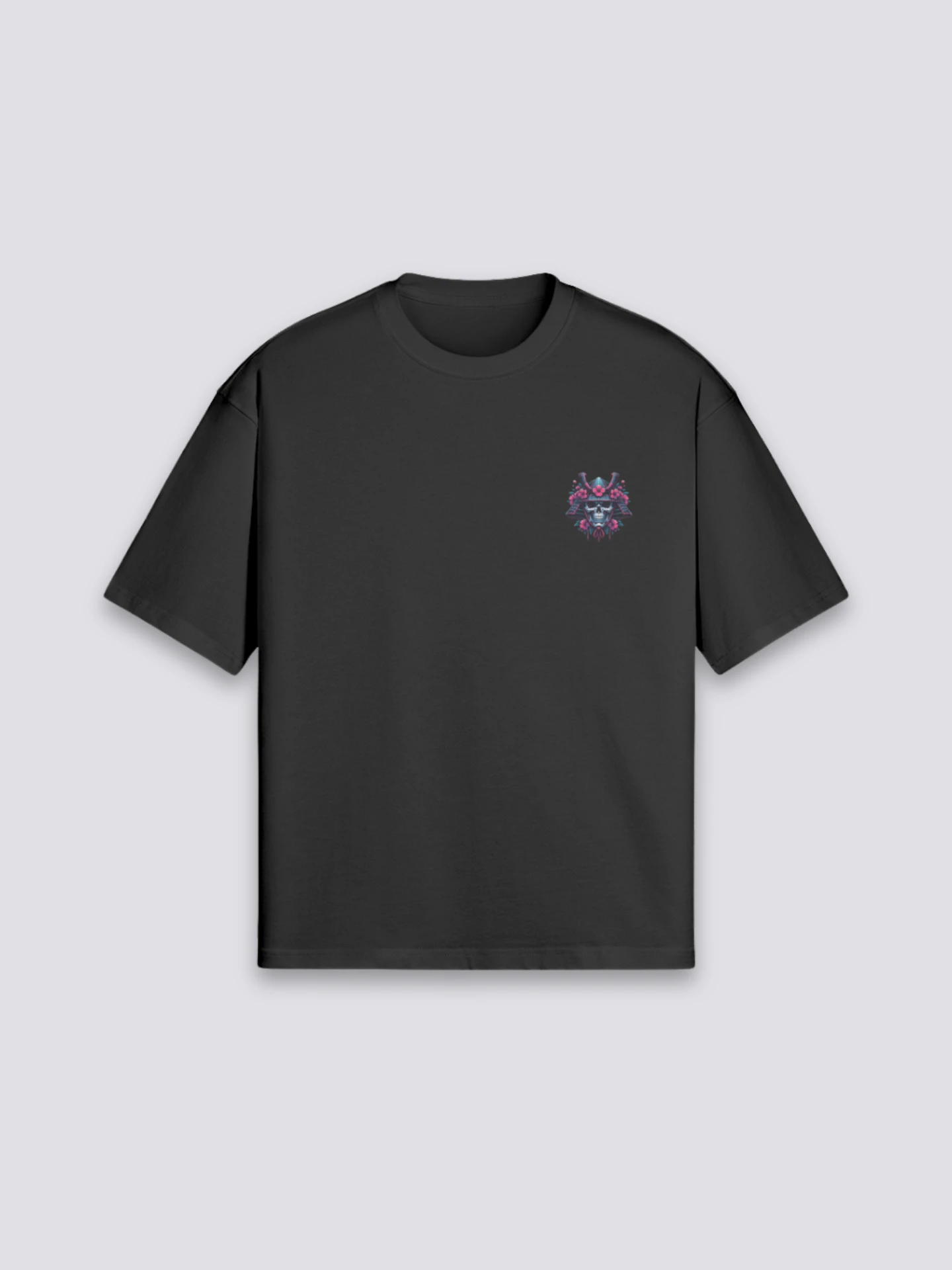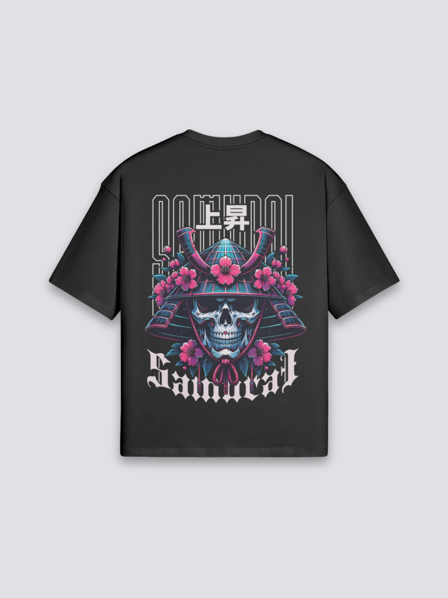 The Cyberpunk Samurai T-shirt features a captivating illustration of a samurai skull in traditional armor, beautifully fused with futuristic elements. The helmet is adorned with bright pink cherry blossoms, creating a striking contrast with the dark, metallic tones of the design. The word “Samurai” is written in gothic letters at the bottom, adding a touch of intensity and mystery to the overall look.