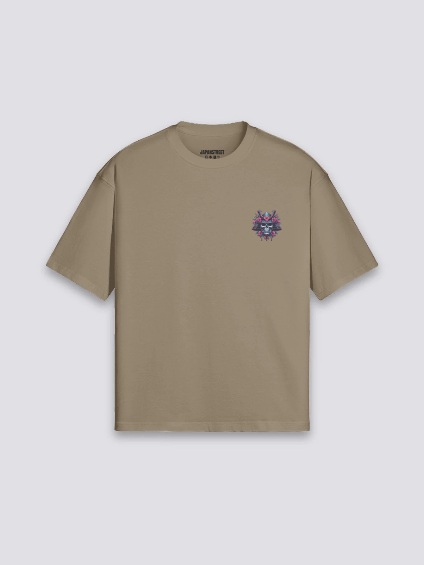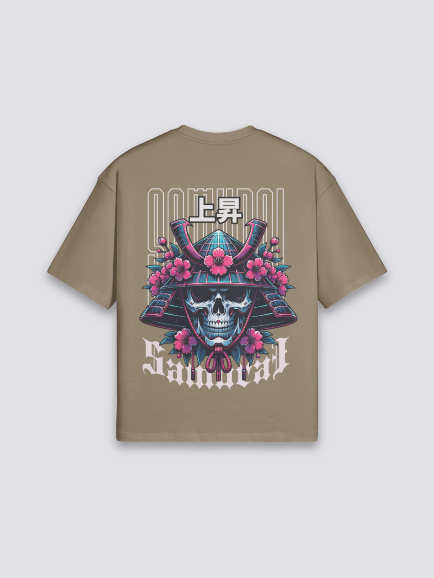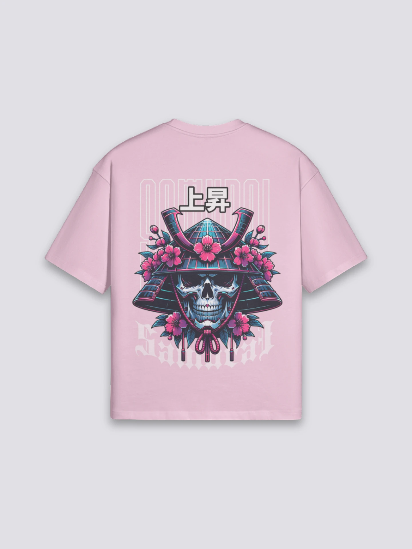 The Cyberpunk Samurai T-shirt features a captivating illustration of a samurai skull in traditional armor, beautifully fused with futuristic elements. The helmet is adorned with bright pink cherry blossoms, creating a striking contrast with the dark, metallic tones of the design. The word “Samurai” is written in gothic letters at the bottom, adding a touch of intensity and mystery to the overall look.