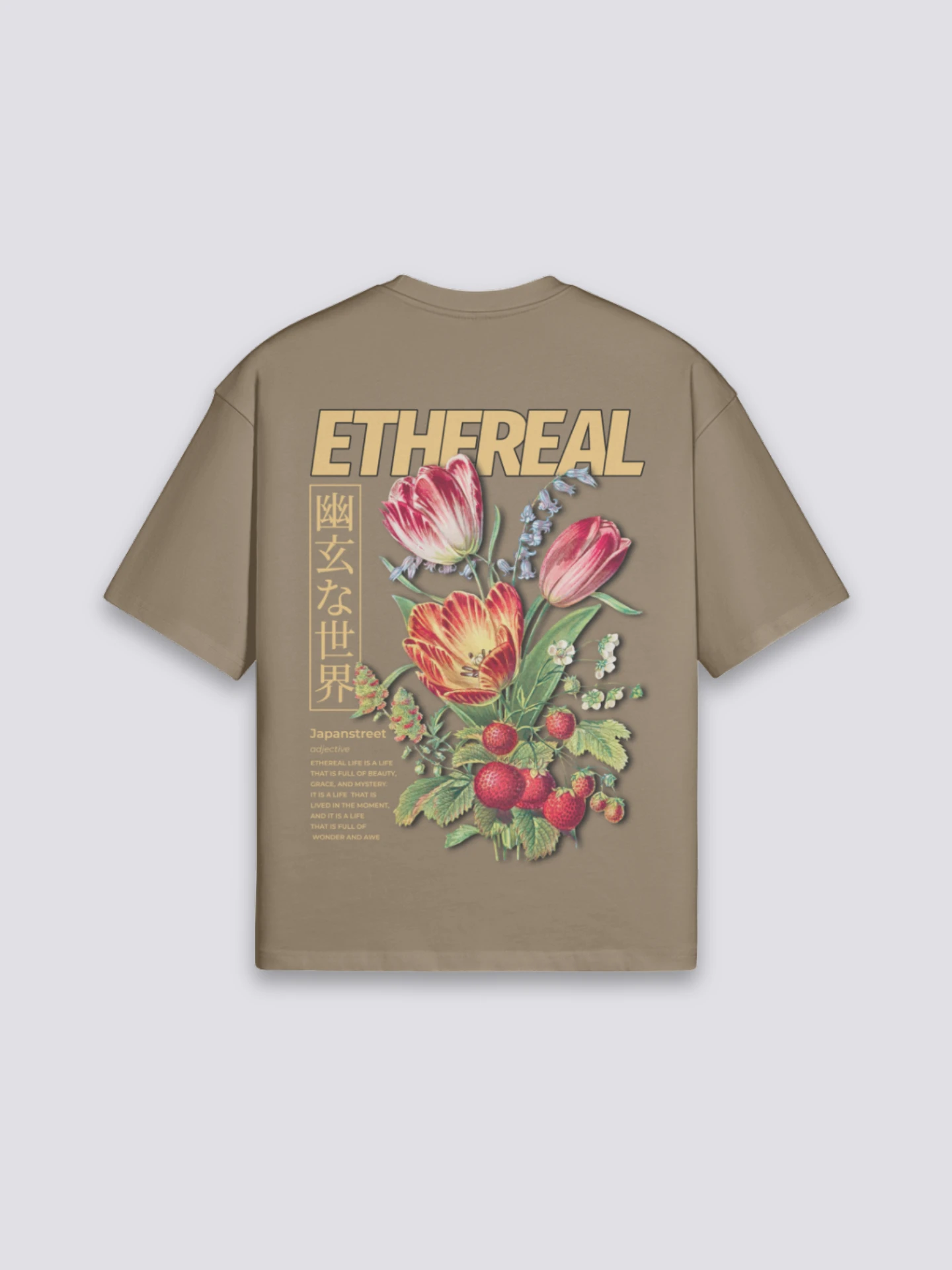 This Japanese Flowers T-shirt showcases a captivating design featuring stunning red and yellow tulips, accompanied by delicate red berries and green leaves. The inscription “Ethereal” in bold letters, along with elegant Japanese characters, adds a touch of mystery and sophistication to the overall aesthetic.