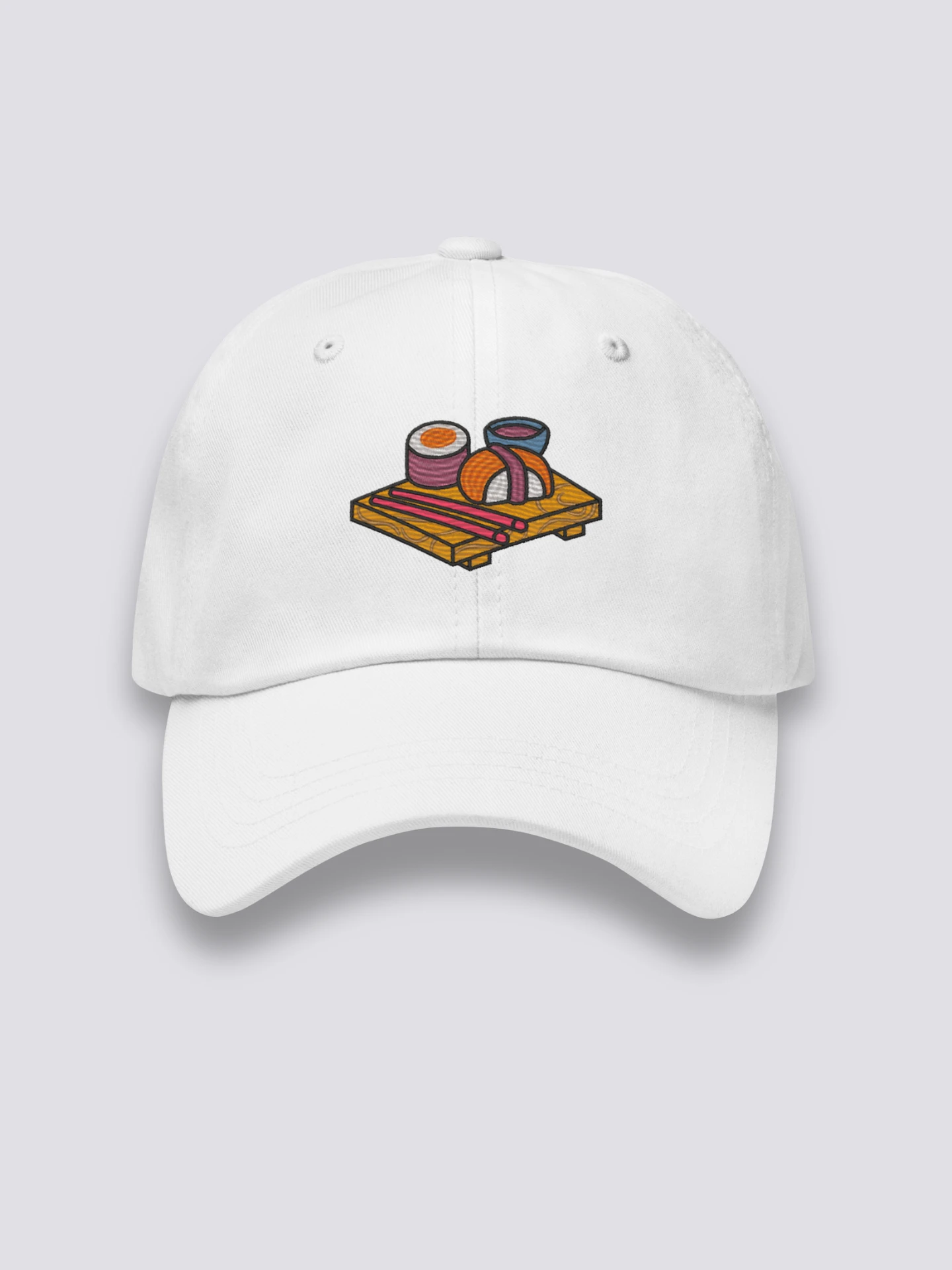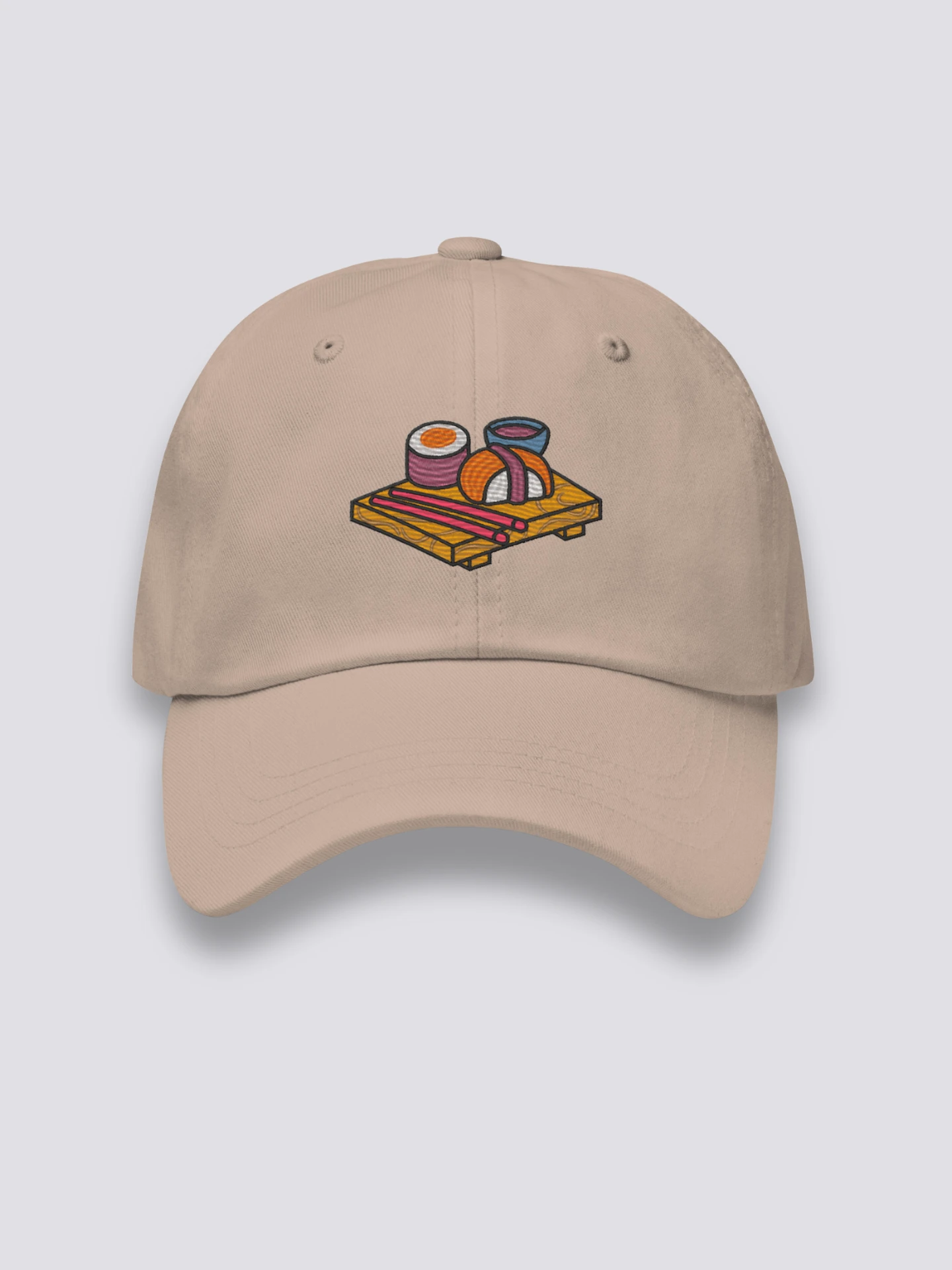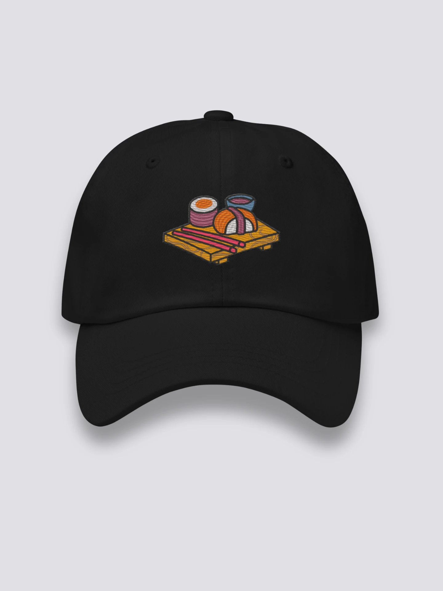 With colorful embroidery featuring a tray of maki, nigiri, and soy sauce, this light blue cap is a tasty nod to Japanese cuisine. Perfect for sushi lovers and fans of quirky fashion, it blends humor, charm, and casual style. A fun and original accessory to wear every day no moderation needed.
