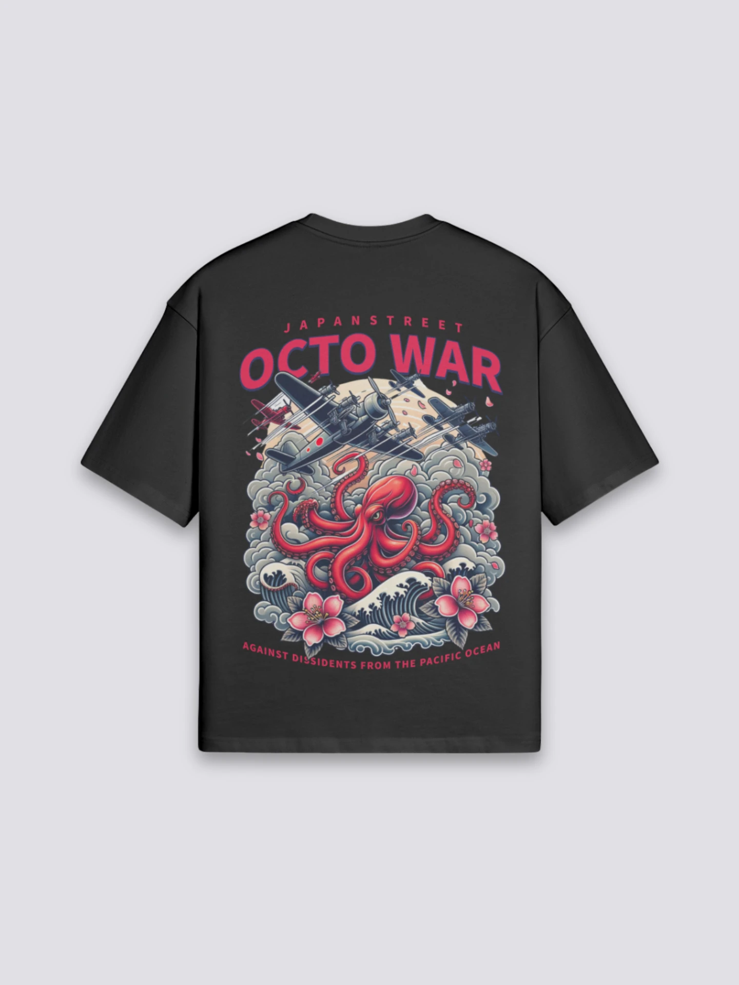 Rich in detail, the design captures the power and determination of this mythical sea creature, with cherry blossoms adding a touch of softness to the dramatic scene. The bold text “Octo War” in large red letters further intensifies this unique and captivating image.
